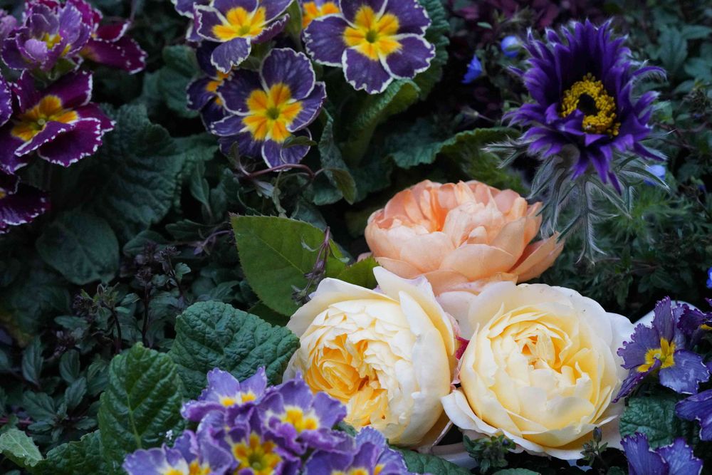 本当に素敵な色彩ですね。「高貴」と「善良」を象徴する黄と橙の色のバラ、でも、私の心は、「憂鬱質」を象徴する菫(すみれ)のプリムラに目が止まってしまいました。