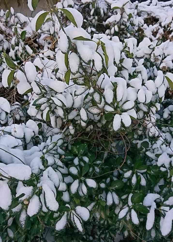 かなり雪が解けてきましたけれど 垣根の🌱葉っぱに こんもりと綿雪が乗っかって まるで 白い花が咲いているようです。