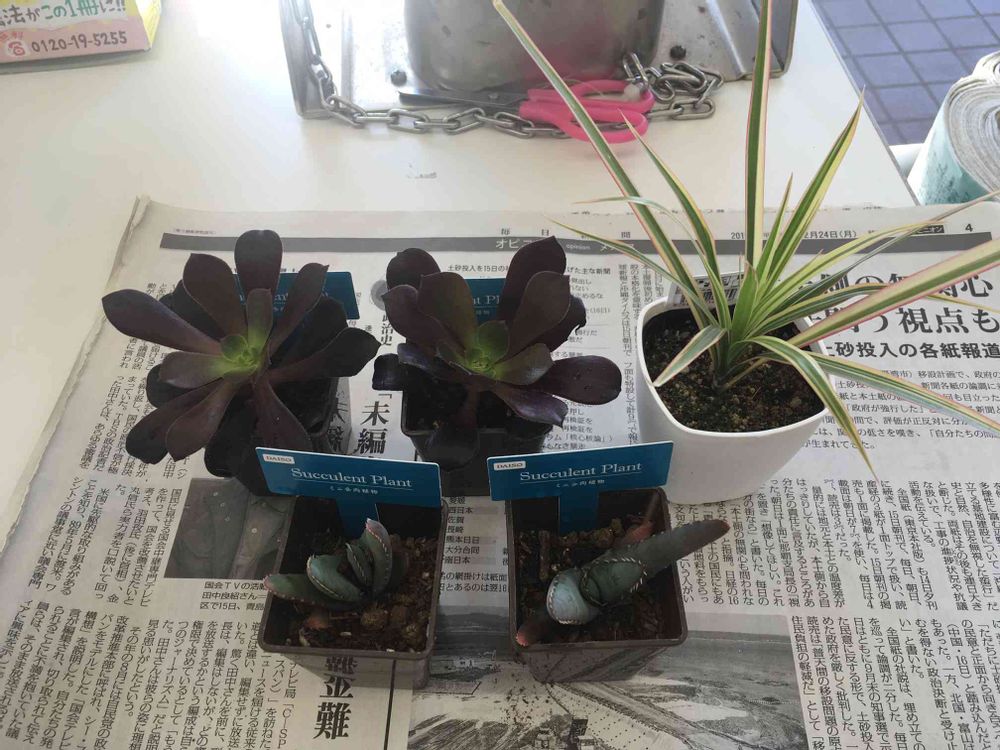 今日は100均一大当たりdayでした🎯。多肉も観葉植物も入荷したてみたいで、種類も豊富だし状態も良かったです。ドラセナと黒法師(であってますか?)とアロエ(かな?)を狩ってきました。