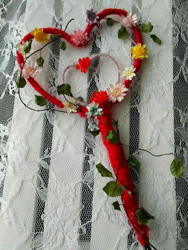 赤に小さなお花が沢山。可愛い葉っぱが絡んで、❤マーク。