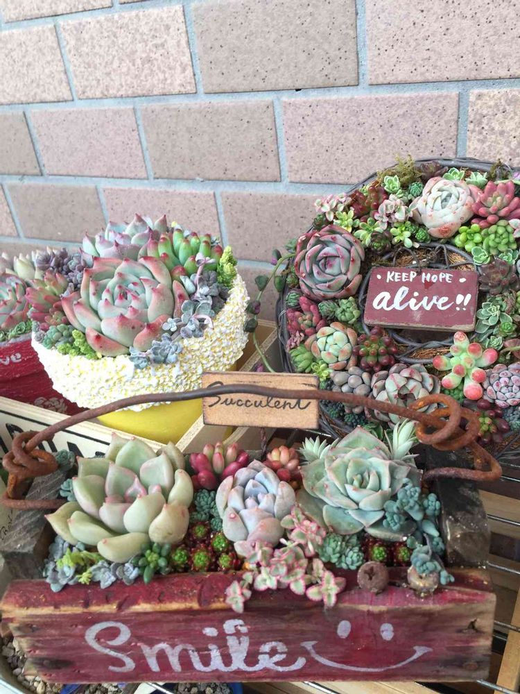 昨年、ikuraさんのWSで作った多肉リースとスマイル木箱の寄せ植え!