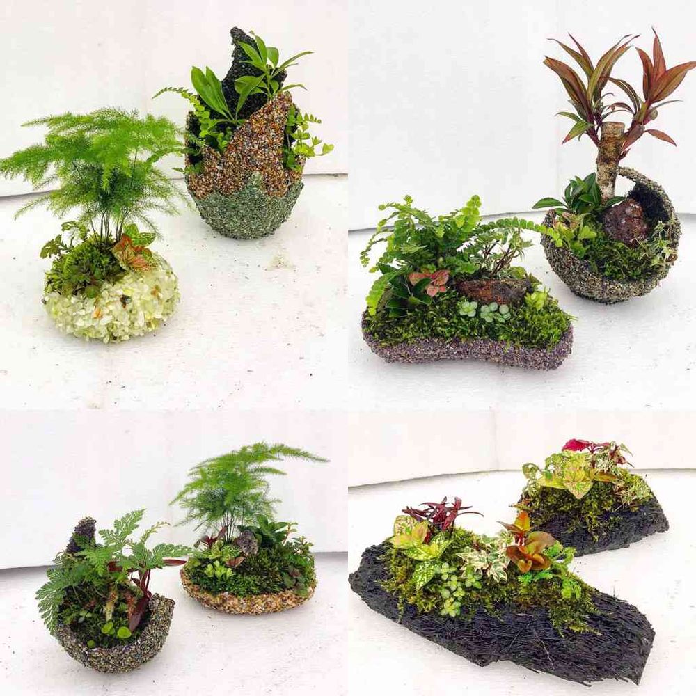 貝殻と砂利を樹脂で固めていろいろな鉢を作っています。 また、ロックウールを使った誰もが簡単にできる寄せ植えを紹介しています。