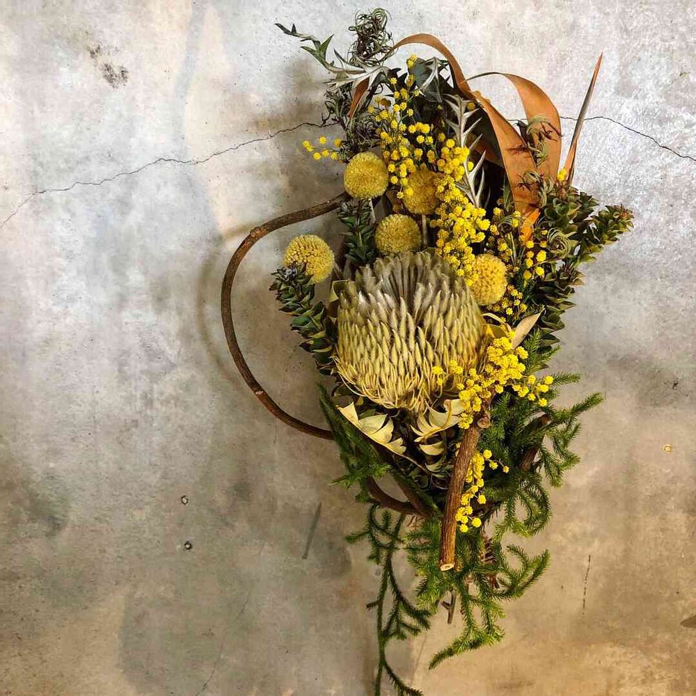ミモザとバンクシアの蔓のリース