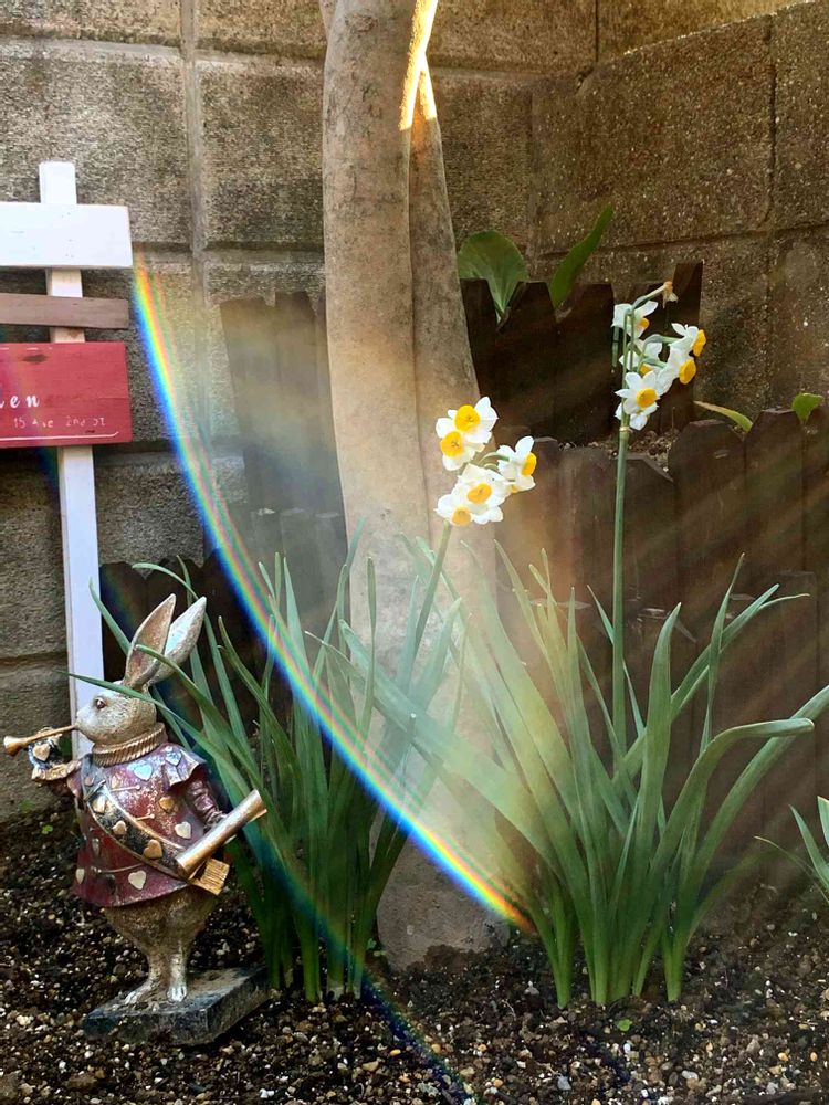 水仙まだ撮ってないから撮ろう~て近づいたらキラッと一瞬光って、虹色スポット捕まえました🌈(゚▽゚*)