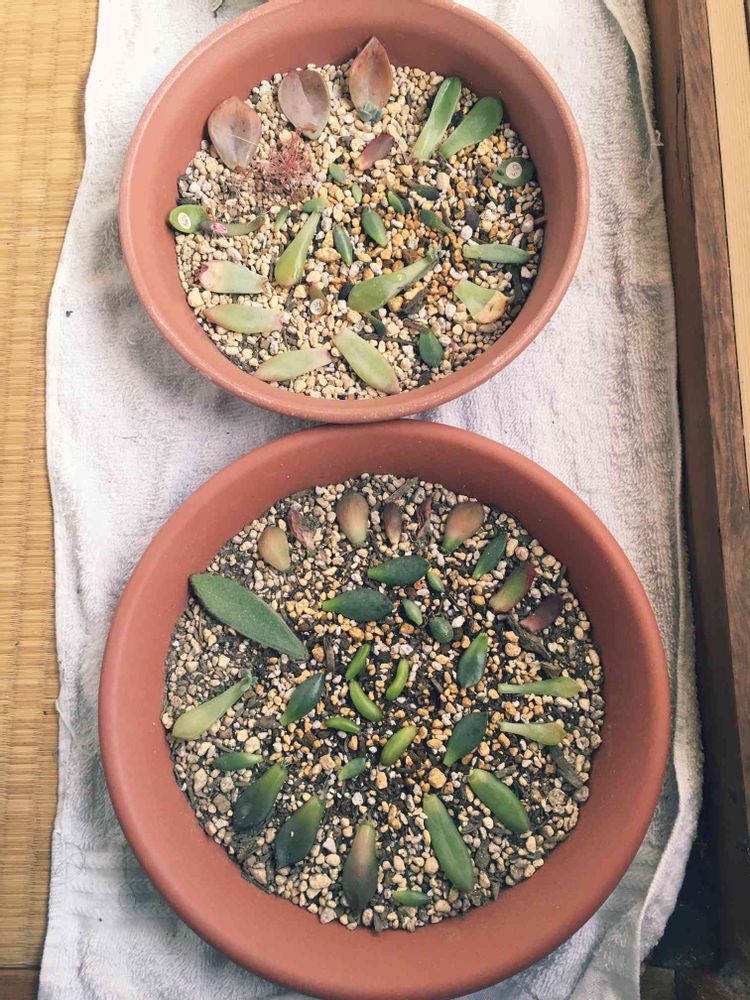 葉挿しの多肉さん達、芽や根は出ていますが、全然大きくなりません😭