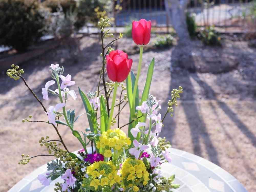 チューリップと菜の花をメインにした優しい春のアレンジメント。