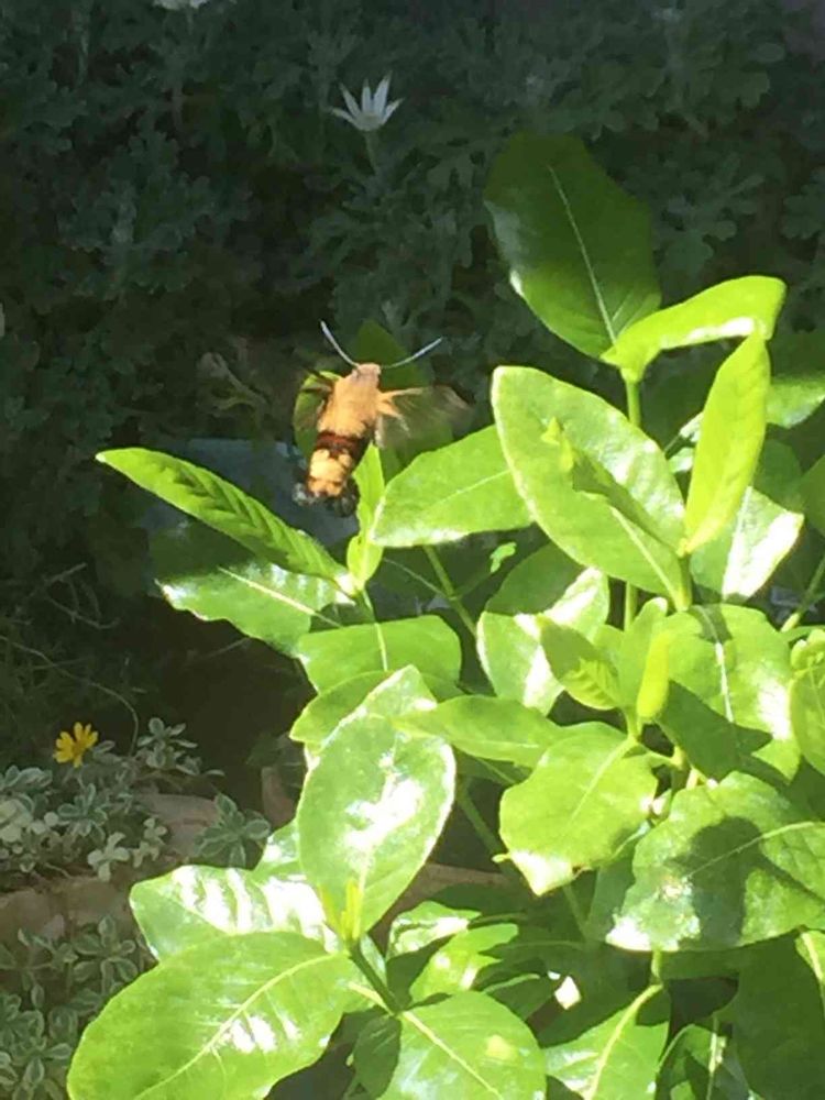 こいつの正体は、オオスカシバって言って、クチナシばっかり狙ってやってくるキモイ蛾?蝶?蜂?を足して割ったみたいなヤツ。顔はひょうきんな顔なんだけど…