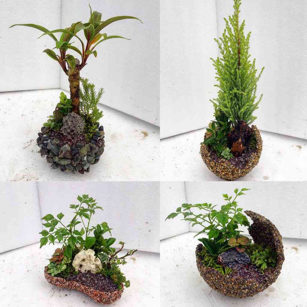 貝殻と砂利を樹脂で固めていろいろな鉢を作っています。 また、ロックウールを使った誰もが簡単にできる寄せ植えを紹介しています。