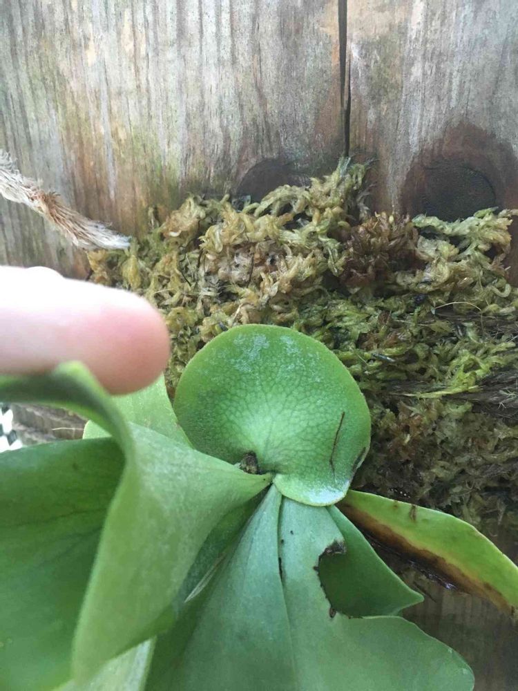 巨大コウモリランのバラした株達の貯水葉はみんな真っ茶色に笑