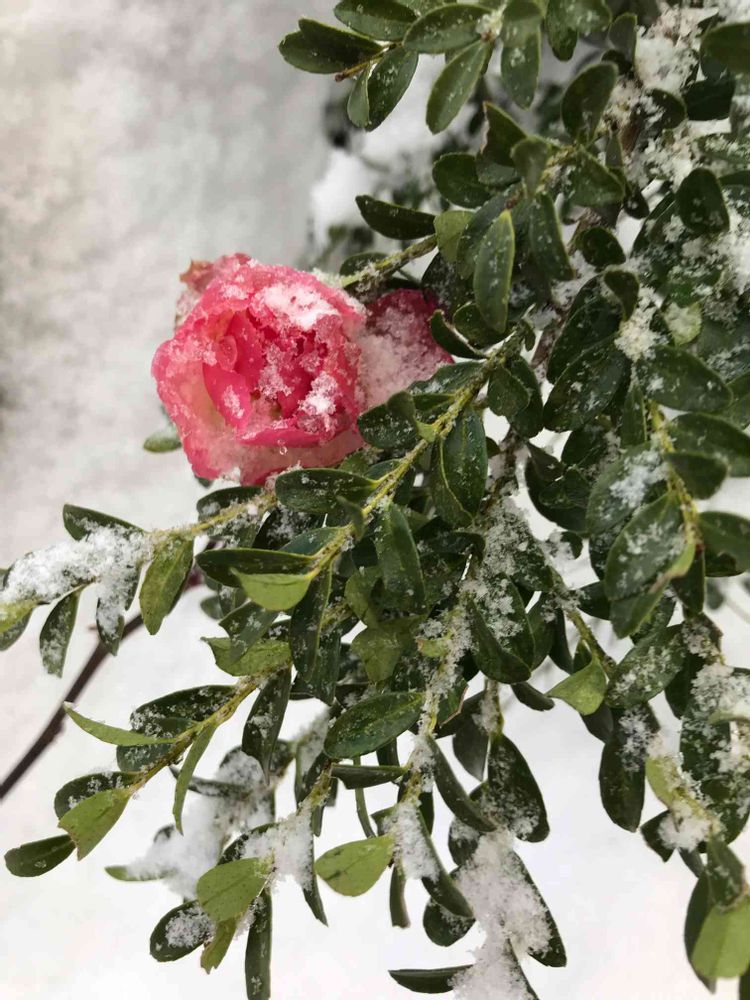 雪の中にピンク色😯 なんと、薔薇が🌹