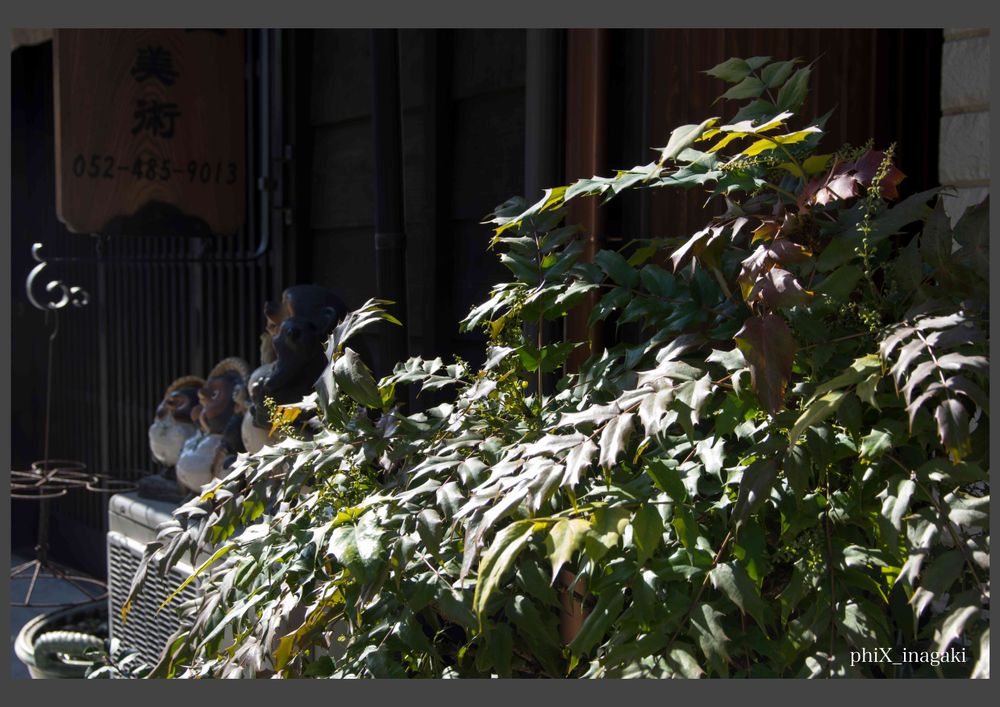 名古屋円頓寺商店街散策。 古物屋さんの軒先の植え込みに強い光を浴びるヒイラギナンテンの植え込みに視線が止まりました。ギラギラ感が出るようにアンダーで撮ってみました。