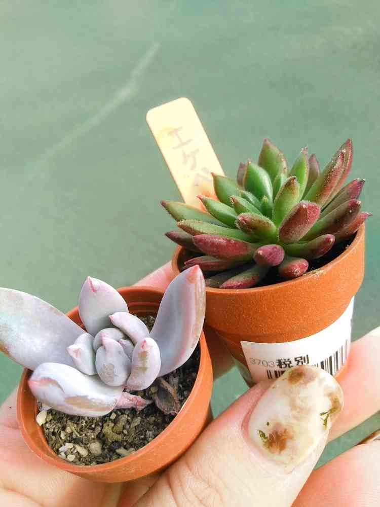 右の子は「エケベリア」の札だけでした。上から見ると緑。葉の裏は赤色です。微毛が生えてます。