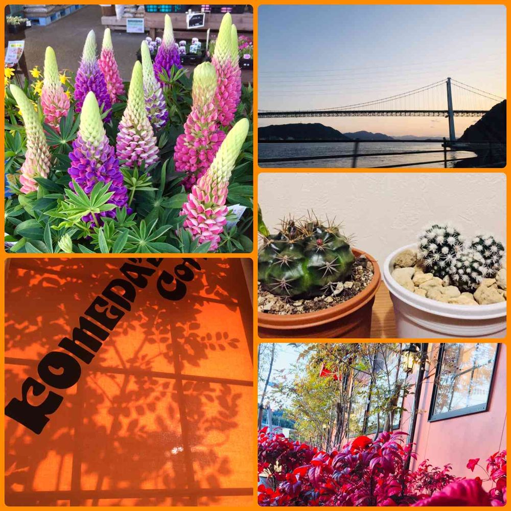 ↪️に、夕暮れの関門海峡、HSのルピナス、喫茶店の木漏れ日、その植栽の紅葉、HSでひと鉢ずつ選んだサボさん(左が私の名無しさん右が妻の明日香姫さん)🌵