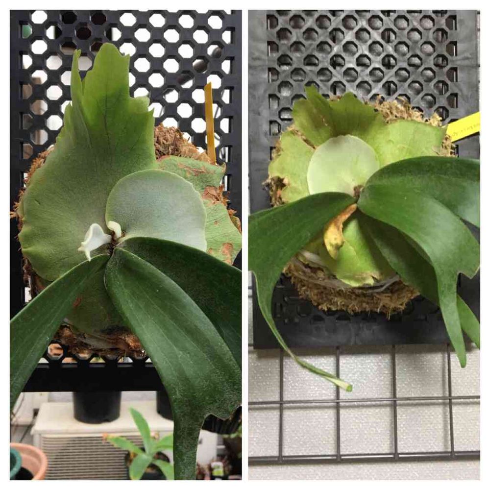 13日の丸い貯水葉がトサカ❓カンムリ❓化してらしくなってきた 貯水葉も胞子葉も2枚づつ同時に成長してるのですが成長旺盛な種類なんですかね?ウィリンキーって