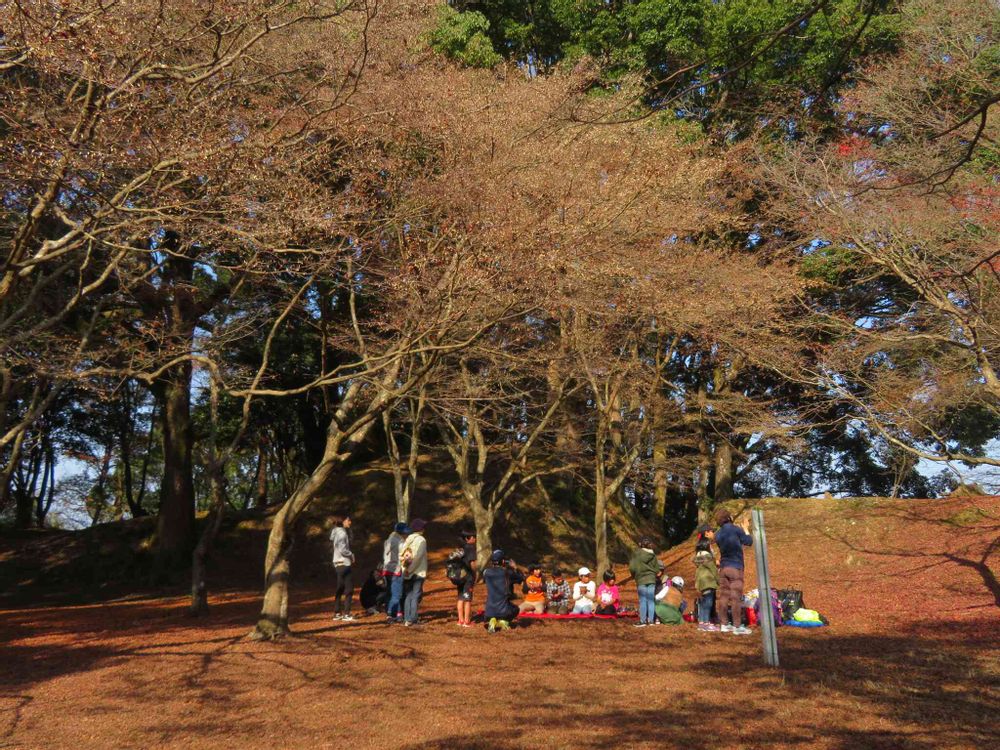 モミジの絨毯の上に真っ赤な毛氈を敷いて野点をする小学生♡