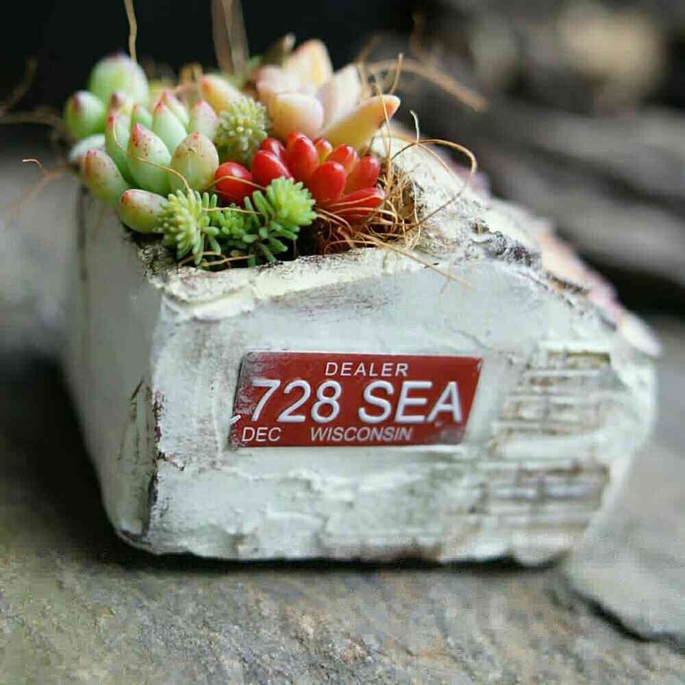 ホワイトセメントハウスに芽だし球根のムスカリと多肉植物を寄せ植えました。