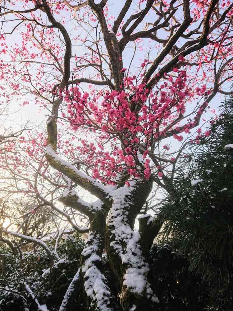 梅の上品なお色にうっすら雪化粧