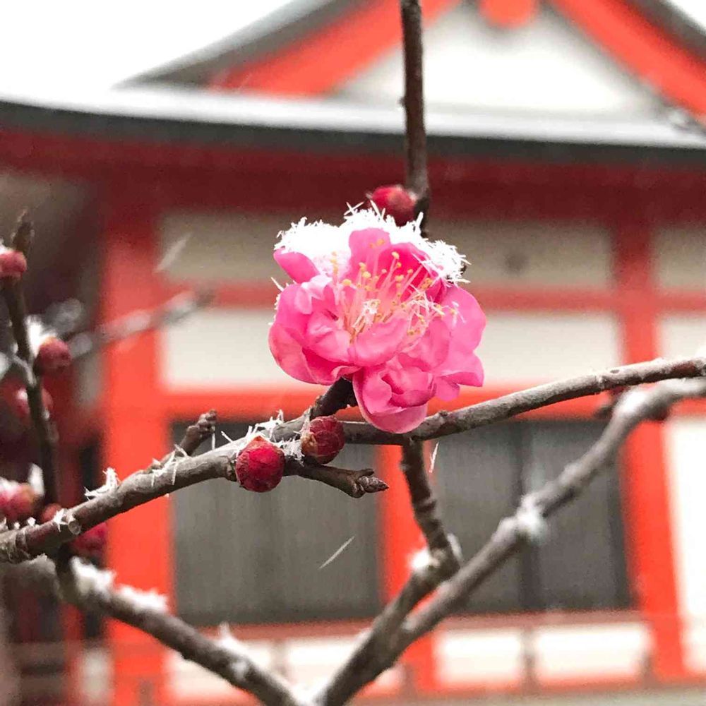 夫と上の子を置いて下の子を連れて雪の中を歩いて向かう途中、神社に咲いていた一輪の梅の花