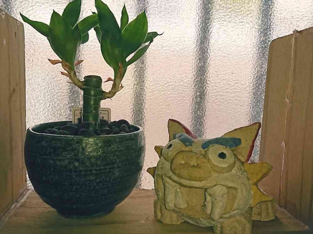 玄関に飾ってある100均で買ったバンブー✨鉢は少し欠けたお抹茶のおわん。シーサーは息子が修学旅行へ行った沖縄での手作りです😌