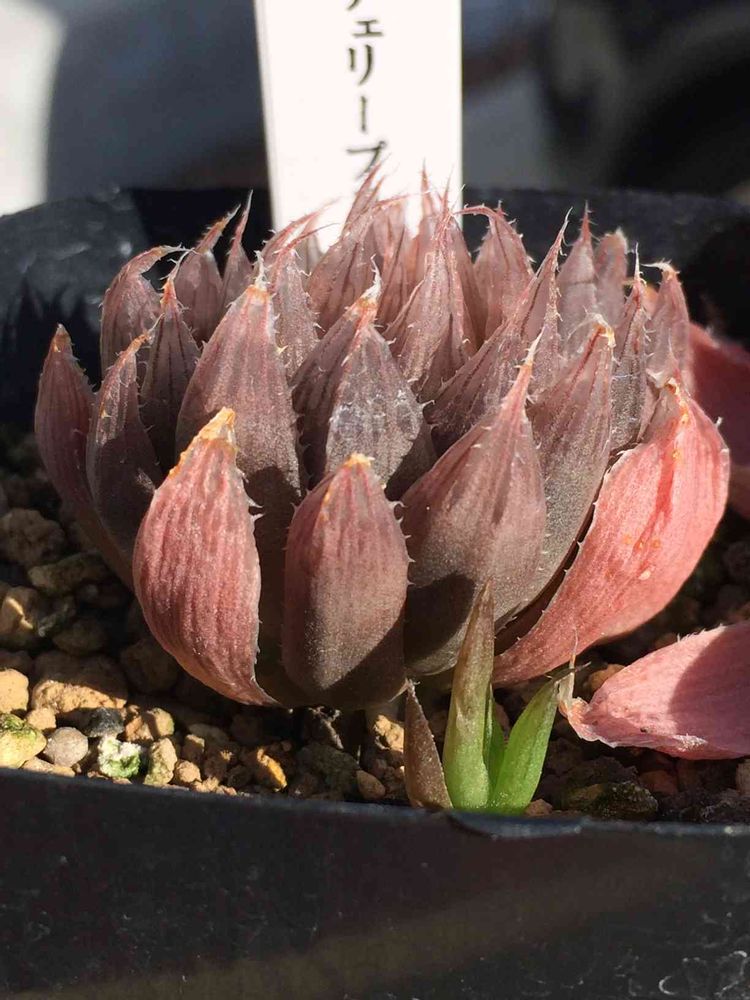 さん。グーグル先生にお聞きしましたが、チェリープリンセスという種類はハオルチアでは出てきませんでした(エケベリアで同名のものはあります)。そこで、英語名で検索してみたところ、チェリーの名のついたチェリークリスタルという品種があり、Haworthia cymbiformis 'Cherry Crystal'でググってみたところ、これに似た姿のハオルチアがありましたので、おそらく名札が間違っているものと思われます。よかったら直してあげてください。