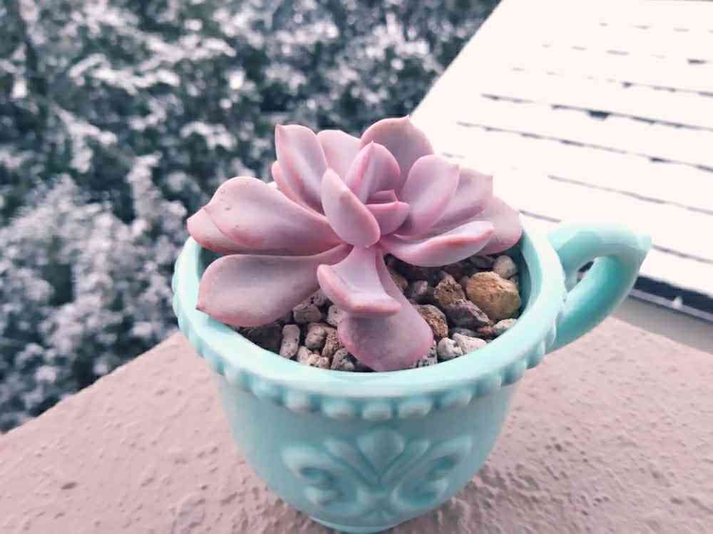 ホームセンターの多肉鉢コーナーにあったマグカップ型に惚れて、植えましたがピンク系と水色の色でファンシーな雰囲気になりました😊💕