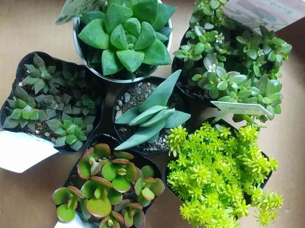 左下から時計回りに、姫花月、吹雪の松、ハオルチア、ボルケンシー、セダム、中央のは札紛失のため名前不明です😭