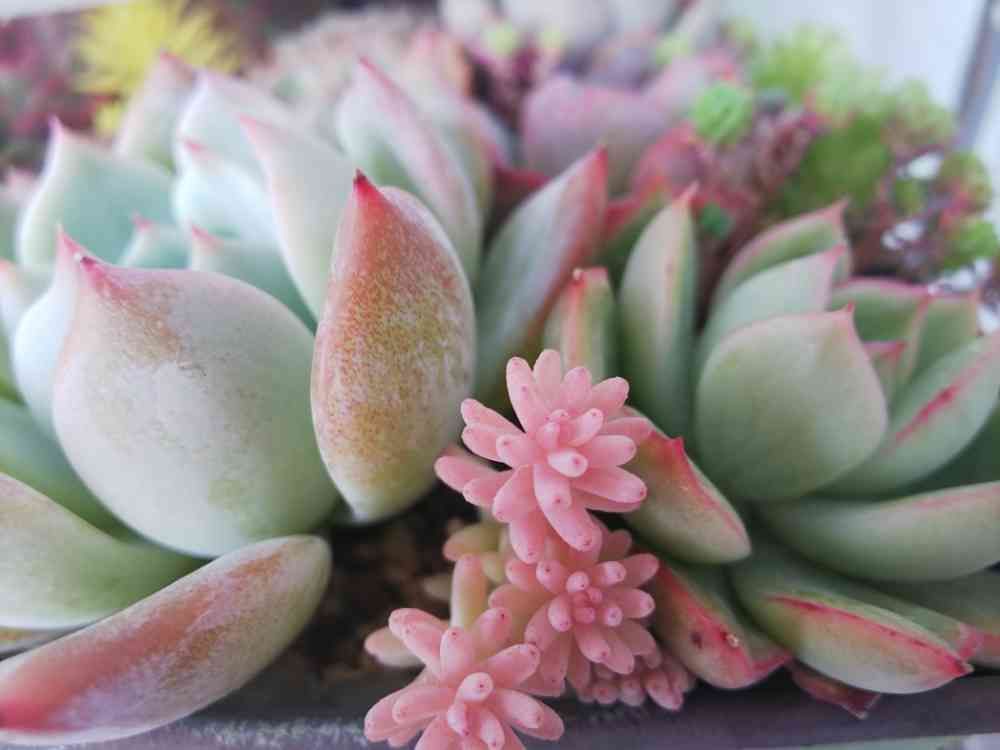 ずっと黄緑だったんだけど、寄せ植えで水少ないからかここだけピンクになってたよー