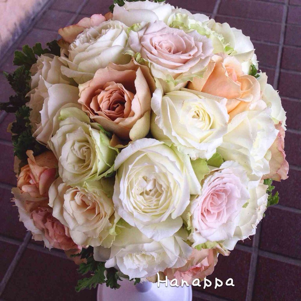 お色直し用のブーケ☺️ラウンドスタイルで、オフホワイトのドレスに合わせて👍😊 朝一番で椿山荘までお届けして来ました✌️😀