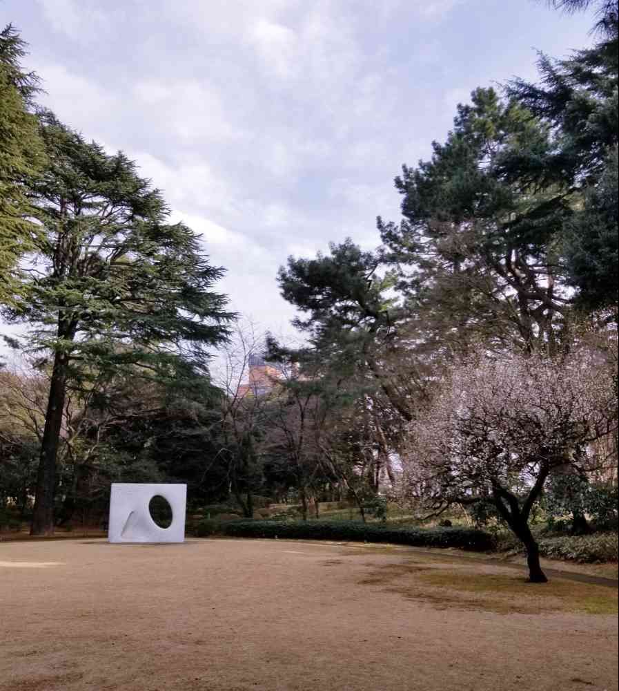 彫刻は安田侃作「風」という作品で、楕円の穴から覗くとフレーム効果で同じ景色が少し違って見えるのだそうです。