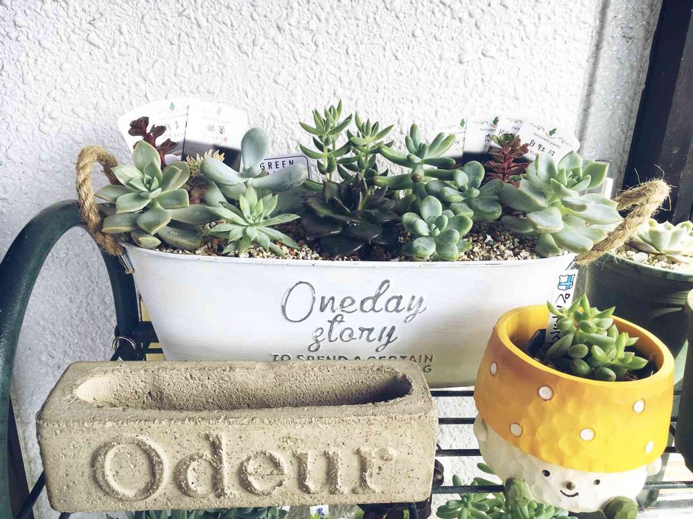 お気に入りの3COINSのブリキポット寄せ♡手前の横長の植木鉢とキノコさんも仲間入りしました。