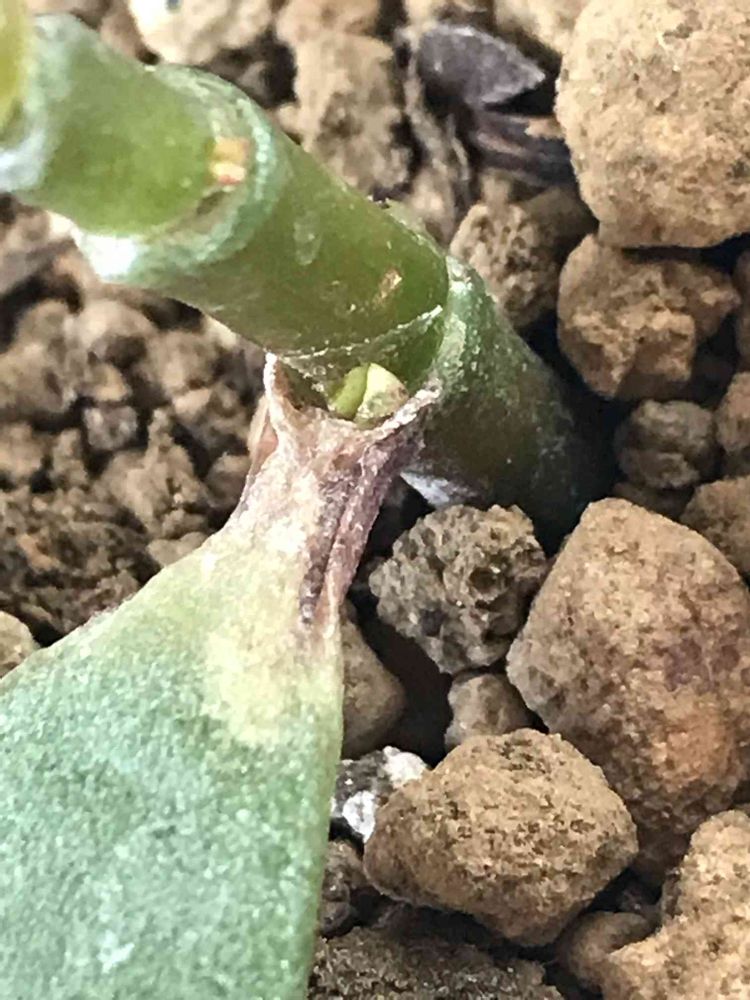 さらに、今、なんとか生えてる奇跡の一枚葉をよく見ると、ここからも新しい芽が笑