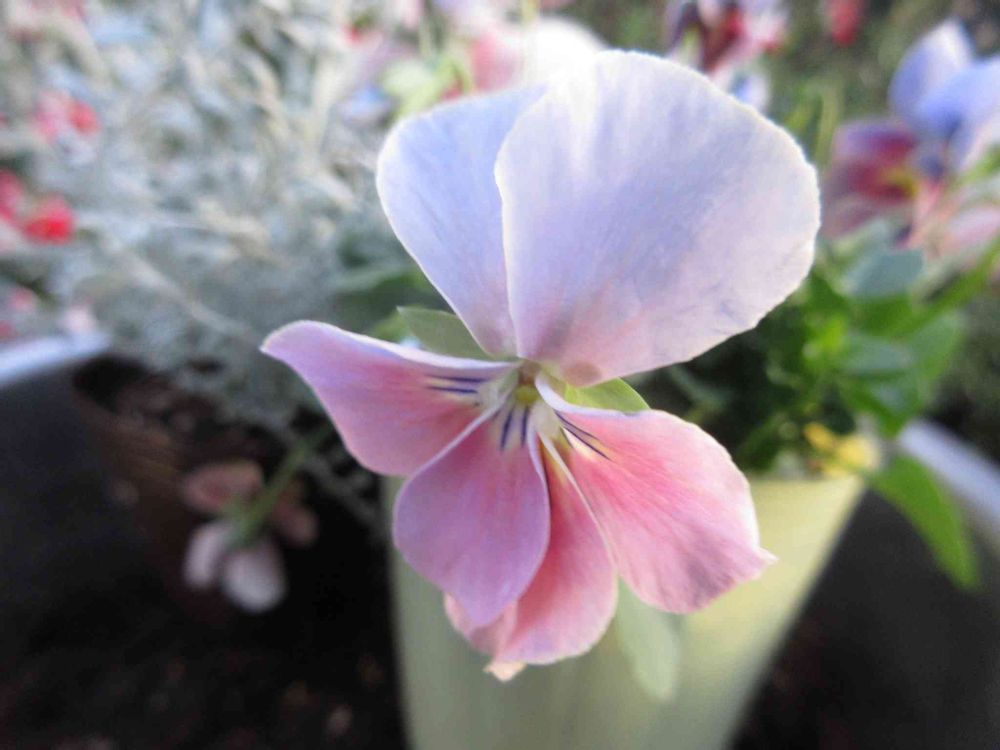 1月、今年になって初めての投稿のビオラは咲き終わりにこんな優しい色になります。これは花びらが一枚多いですね。