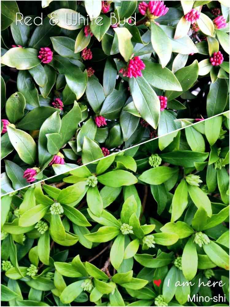 散歩道の植え込みで見かける沈丁花のツボミ。赤と白(緑…❓)のツボミが美しい❗🌸🌼🌿😃