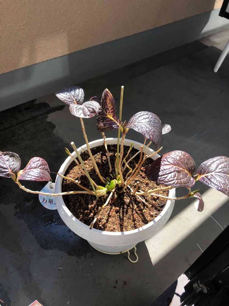 ガクアジサイの万華鏡なんですが、まだ赤黒くなった葉が残っています。