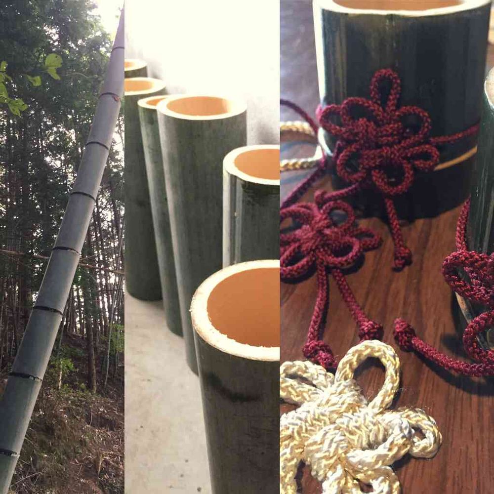 竹を伐って組紐つけて、これは花器でしょうか⁉️