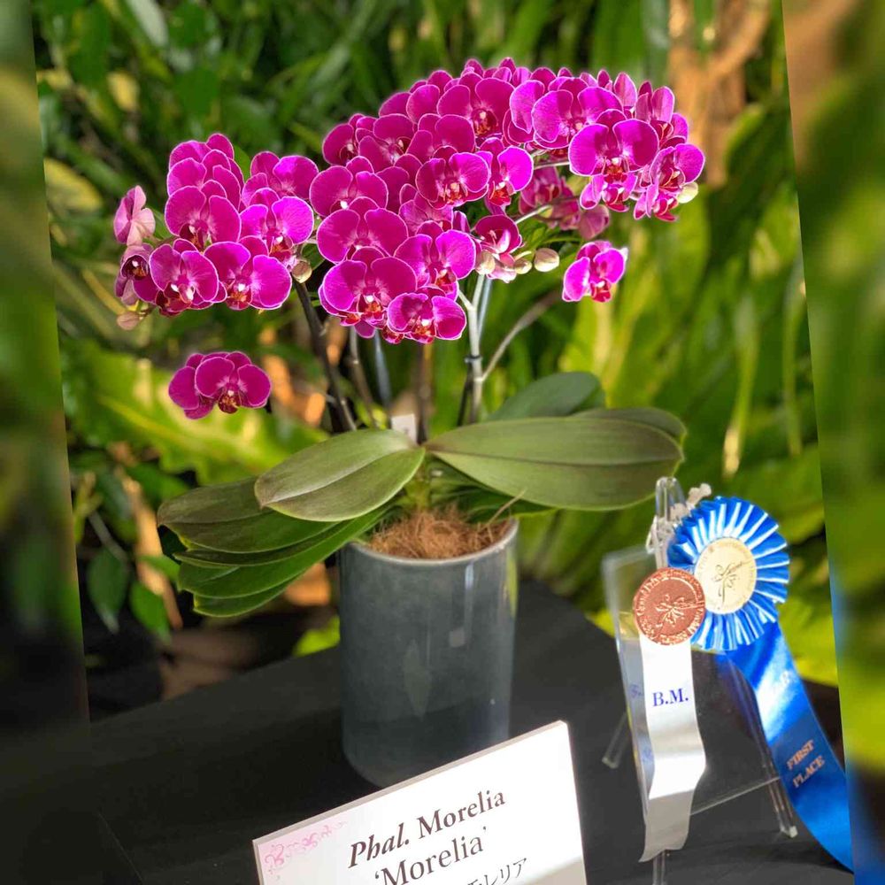 椎名洋ラン園の「モレリア」がブルーリボンのトロフィー賞を頂きました。他にも「パプリカ」「サクラン」「エレガンスホワイト」「キラキラ」「ナオミゴールド」がリボンを頂きました。