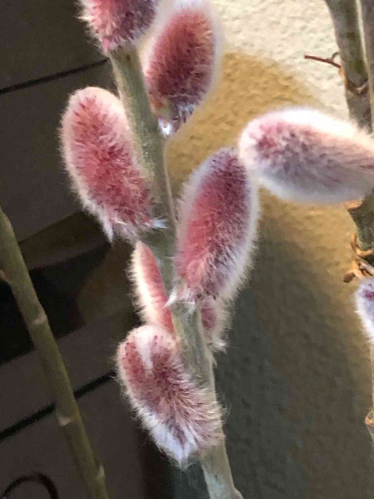 こんにちは♪ 初めまして✳️ 私もピンクのネコヤナギを初めて1枝買いました🌾 花瓶の中で黄色のお花を咲かせ その内にシルバーに変色💫 気が付いたら根が這えていて 今では庭に植えられています🌿 確か200円もしていないのですが…😊