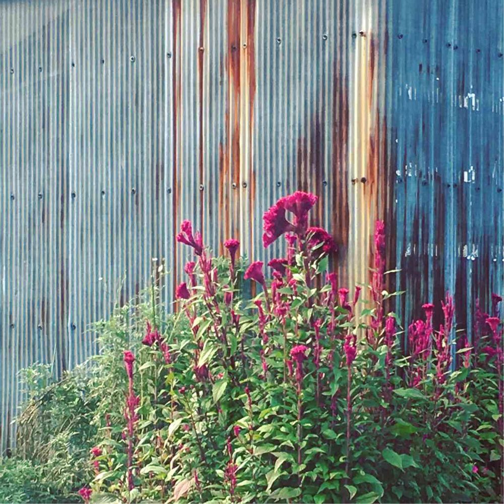 通りすがりの、トタンとトサカケイトウ。