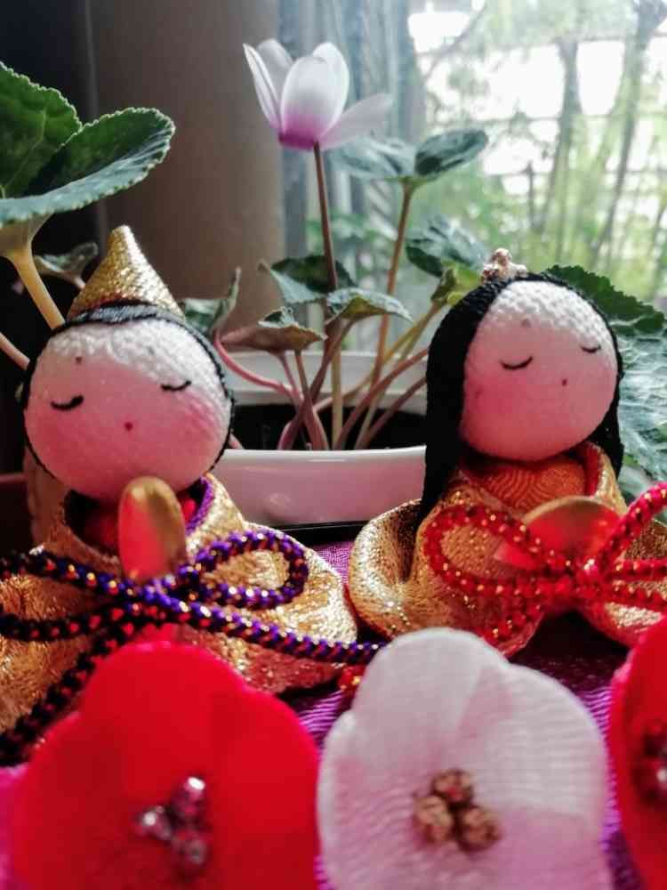 小さなシクラメンと、ちりめんの小さなお雛様🎎春の陽射しの中でみんな🎶眠そう・・