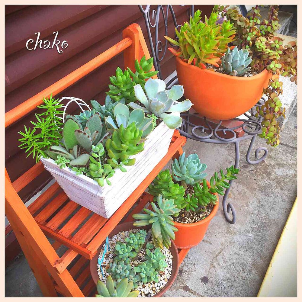 オレンジの鉢にオレンジの棚カワイイですね😊多肉の緑が映えて良いですね😚👍
