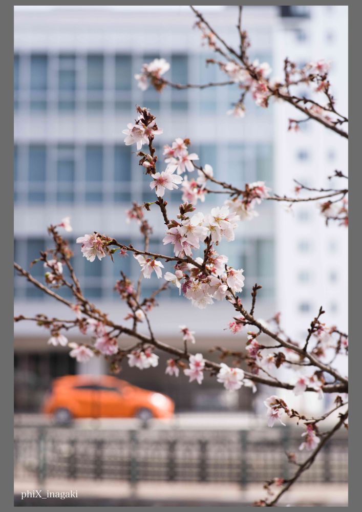 桜の花をアップで撮っていると丁度対岸の色鮮やかな車が通りました。その一瞬をカメラに納めました。