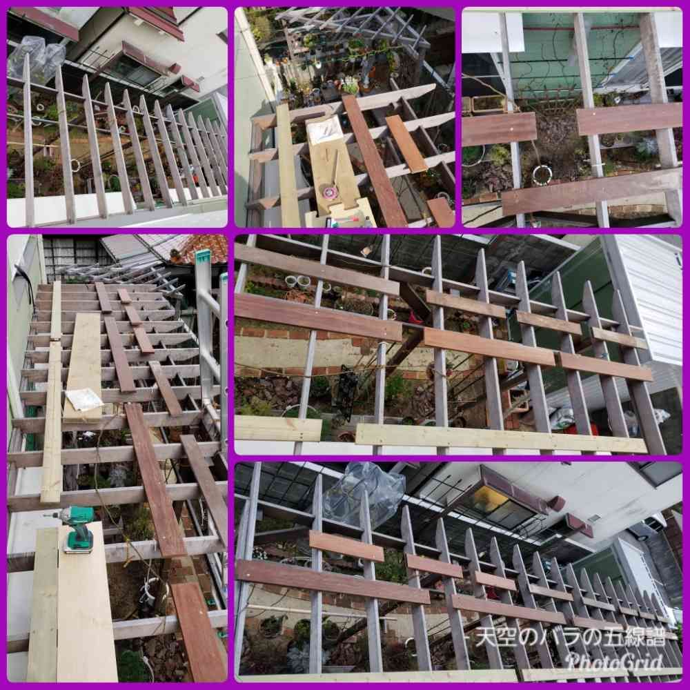 そして、下段右が完成した第三パーゴラの写真です。その他の写真は、取り付け途中の今日の写真です。
