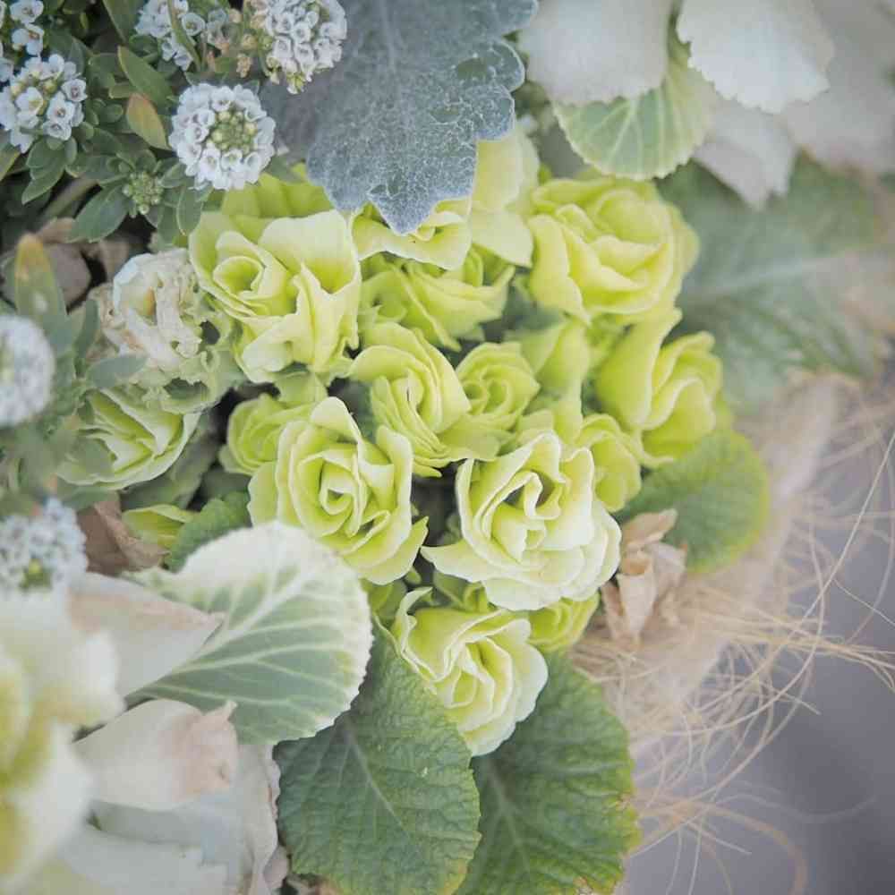 寄せ植えのプリムラジュリアン「マスカットのジュレ」。