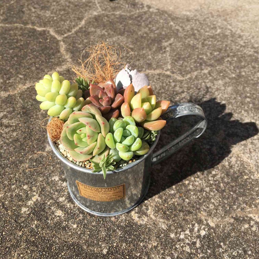 今回は、ブリキカップにギュッとカット苗の多肉ちゃんズを詰め込んできました。