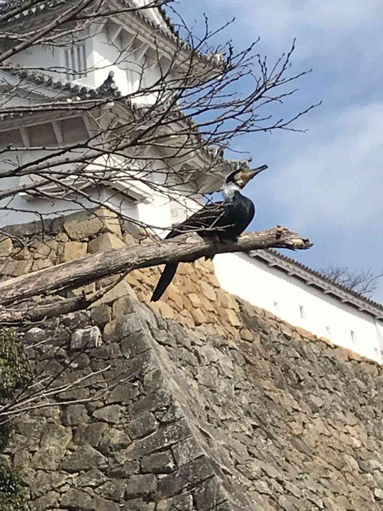 お城と石垣を背景に木の枝で佇む鵜の姿は絵になりますね😆