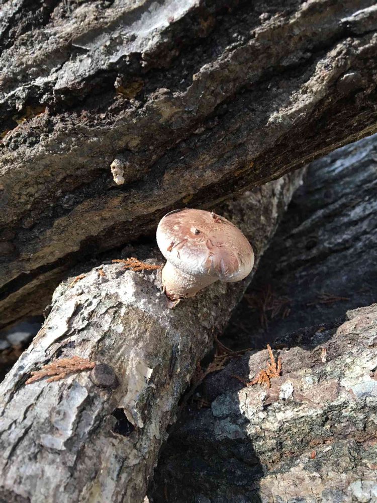 去年の今頃に植菌したもので、生えてくるのに、ふた夏かかると聞いていたのですが、細い原木は菌糸がまわるのが早いらしくもう出てました🤗