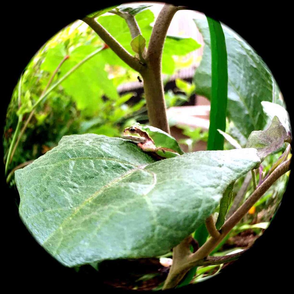 ナスの葉っぱに小さなカエルが(*´ω`*)