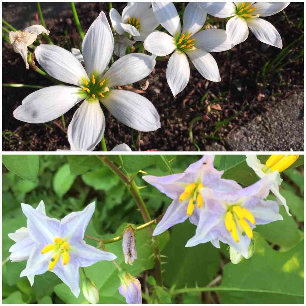 上はタマスダレ、下は、多分、ワルナスビだと思います。