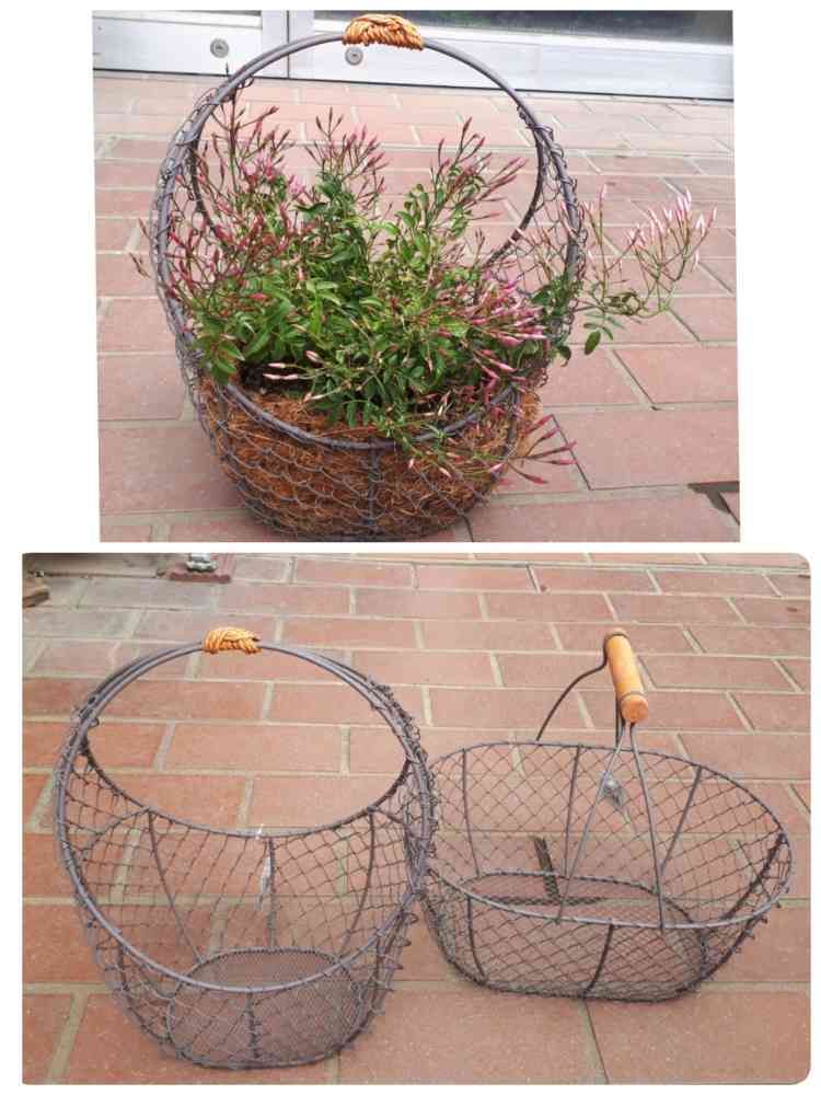 今日はワイヤーバスケットにヤシがらをひいて羽衣ジャスミンを植えてみました。