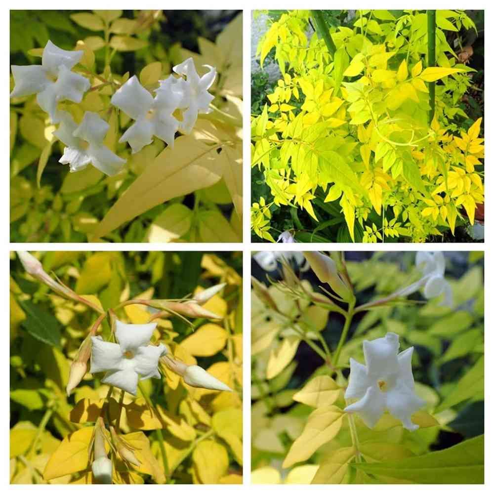 黄金葉ジャスミン・フィオナサンライズです。今日のお花の羽衣ジャスミン(Jasminum polyanthum )の黄金葉変種だと思っていたのですが、投稿するために調べたら、別種の、コモンジャスミン(ソケイ Jasminum officinale)の変種でした。芽出しのころの黄金葉が美しく、羽衣ジャスミンほどの花付は無いですが、花は良い香りがします。羽衣ジャスミンより耐寒性が強くて、氷点下でも戸外で越冬します(暖地なら常緑ですが、氷点下では落葉しちゃいますが)。8号の鉢植えにして3年たちますが、そろそろ根が詰まっているので春には大きい鉢に植え替えようと思っています。
